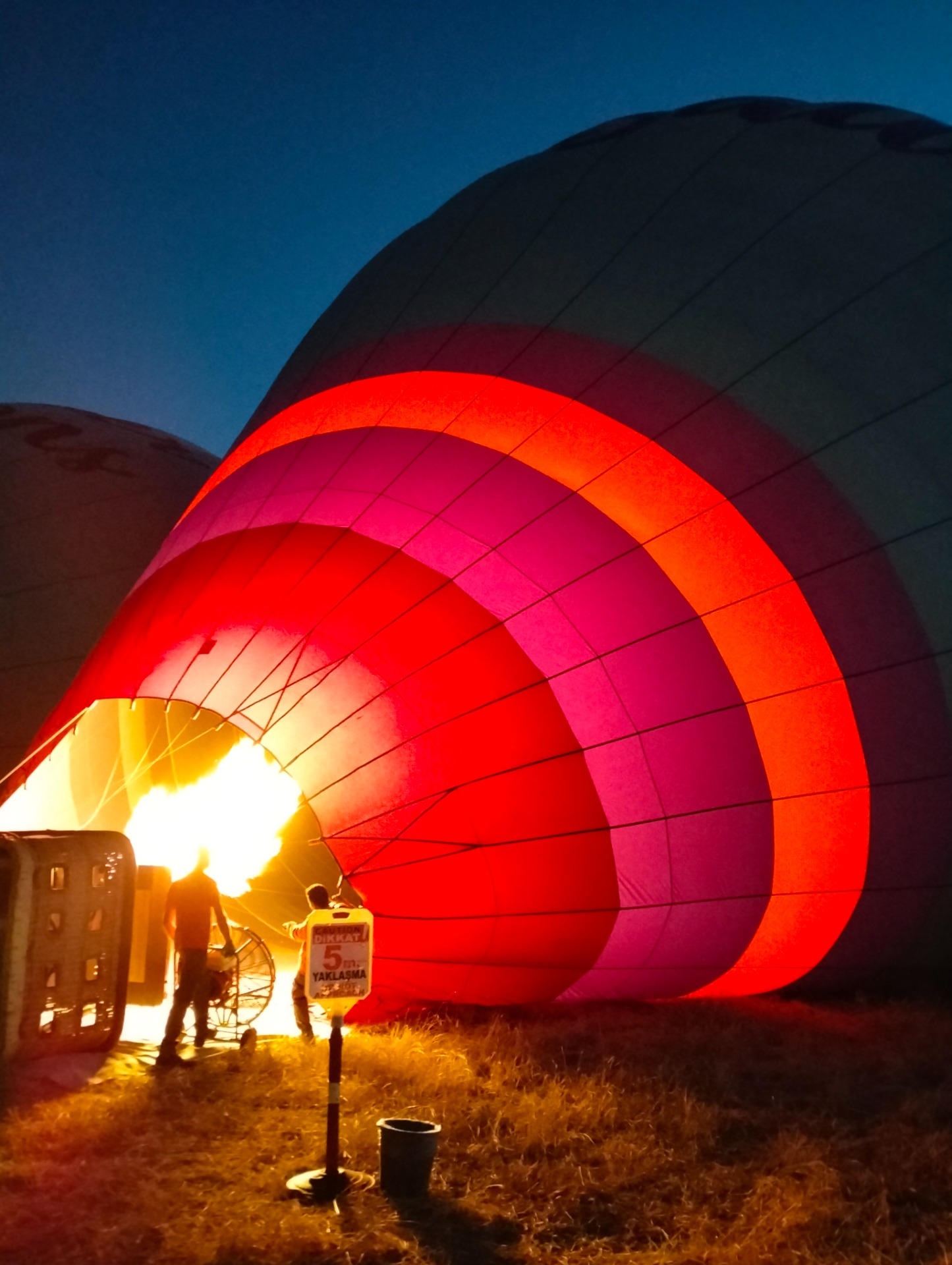 La mattina dopo, mentre tutta Goreme dormiva, ci sono venuti a prendere in albergo per portatrci ad uno spiazzo apena fuori città. Nel buio si distinguevano appena i due enormi cesti che presto avrebbero portato noi e gli altri a sorvolare la Cappadocia. Mentre incominciava a rischiararsi il cielo, hanno cominciato a gonfiare le imponenti mongolfiere, molto più grandi di quanto immaginassimo.
