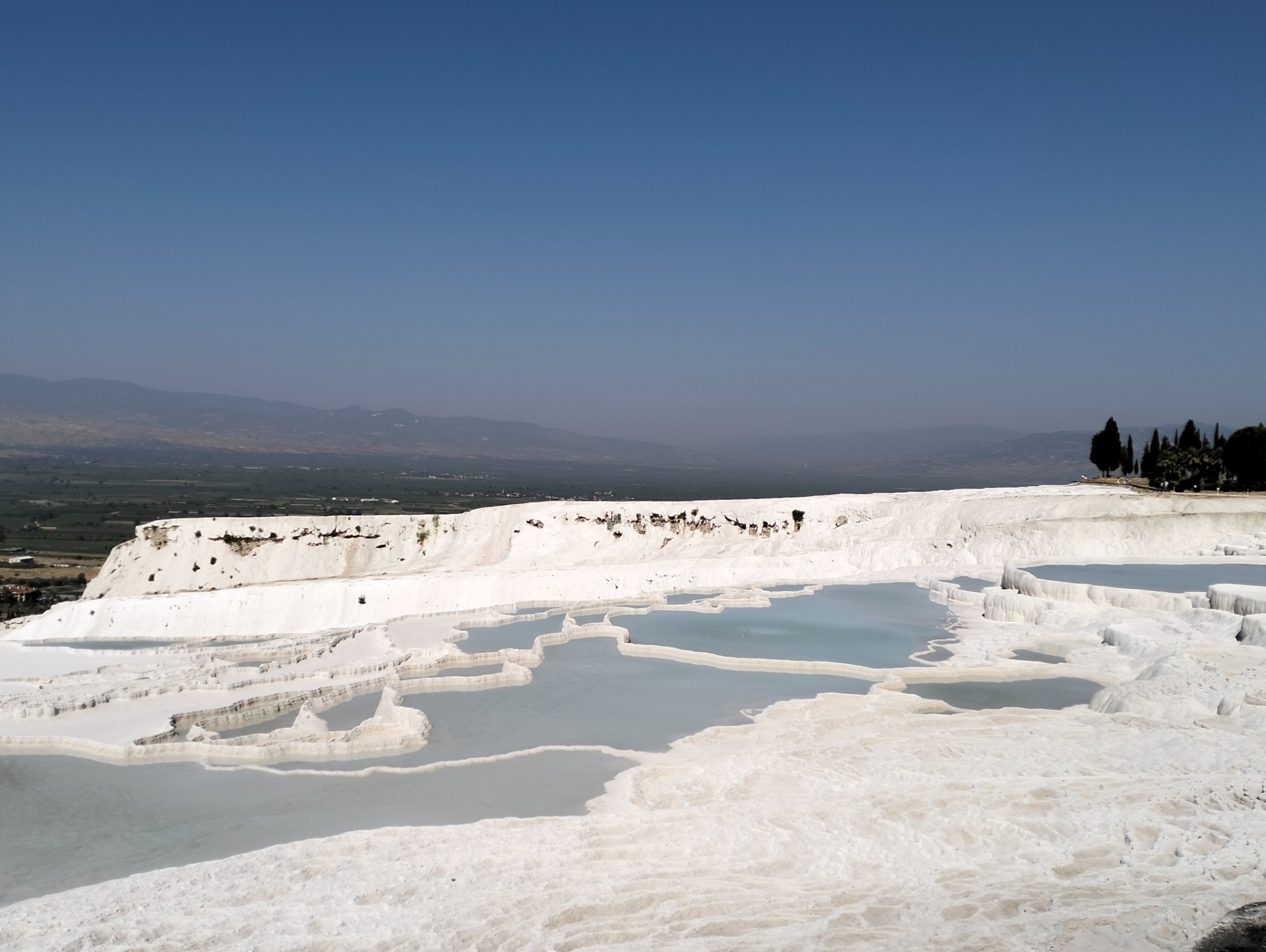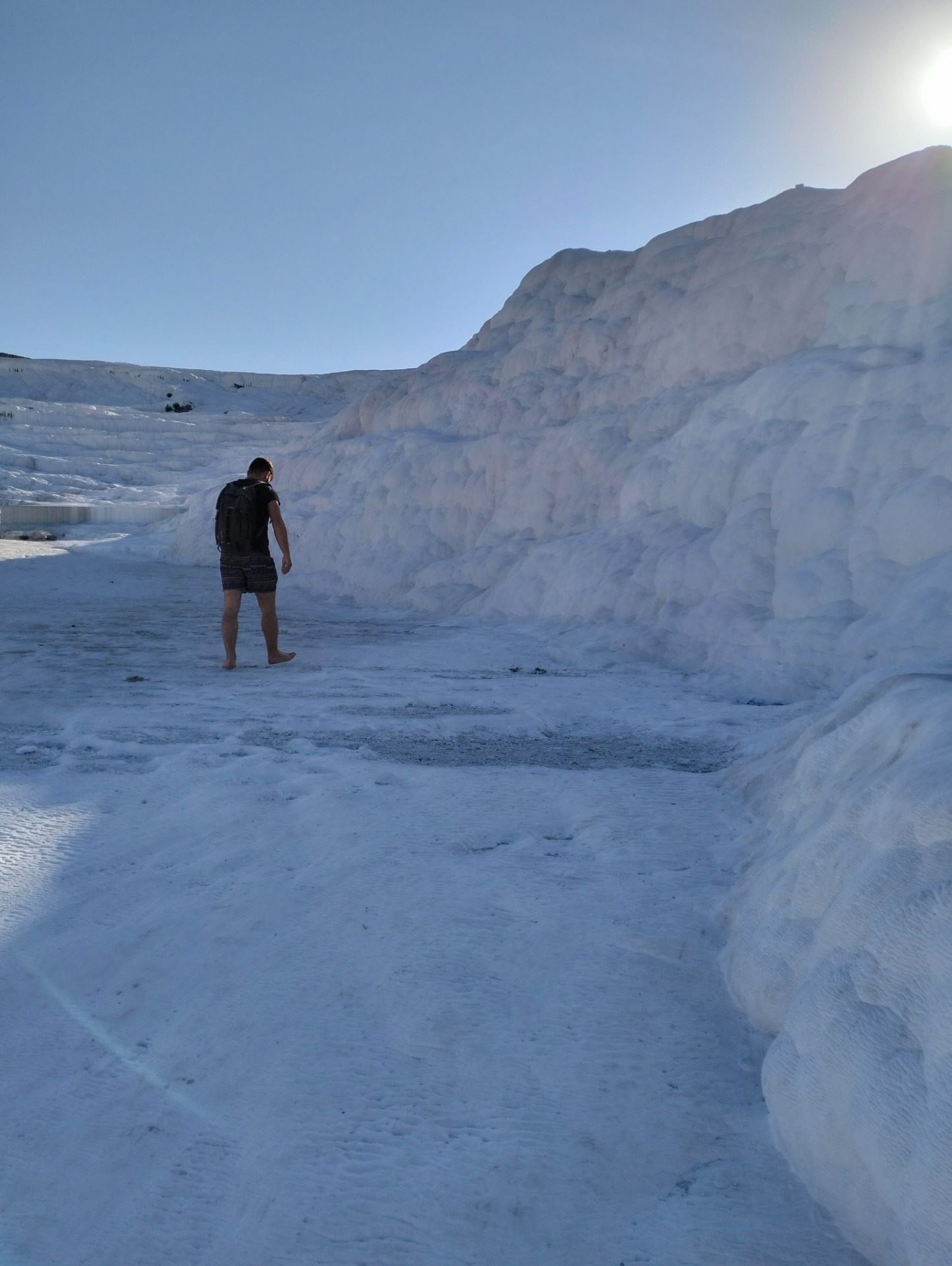 Nel parco è vietato entrare con scarpe o sandali, bisogna procedere scalzi sul travertino bianco, per evitare di danneggiarlo. Già all'ingresso questa immensa macchia bianca nel paesaggio colpisce. Sembra di iniziare a camminare su un ghiacciaio, anche se letteralmente la traduzione di 'Pamukkale' è 'castello di cotone'.